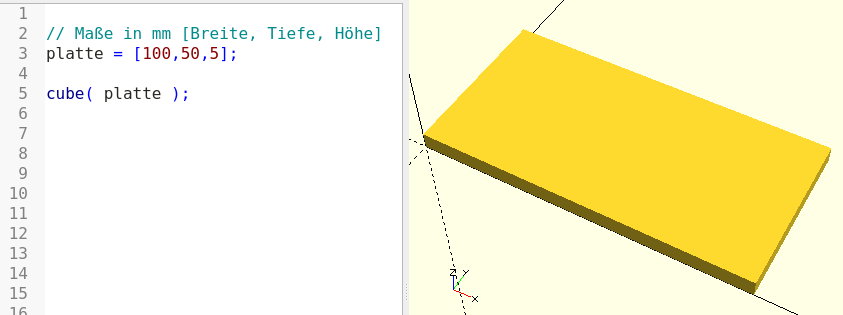 cube( platte );Wir definieren uns einen dreidimensionalen Vektor platte, der die Maße unserer Platte enthält und übergeben diesen Vektor als Parameter an die Grundform cube (Abbildung 2.).