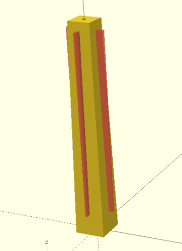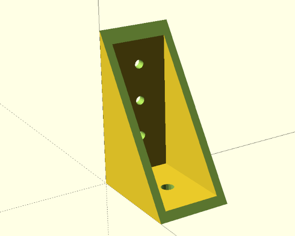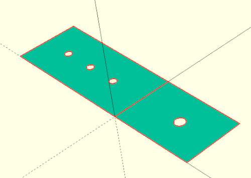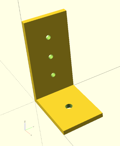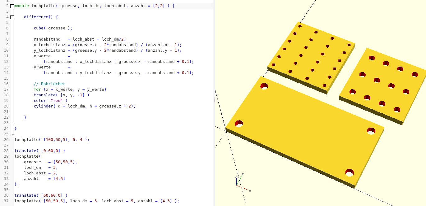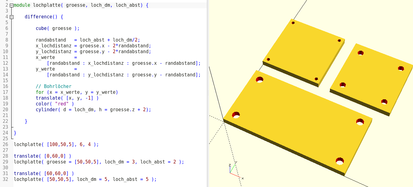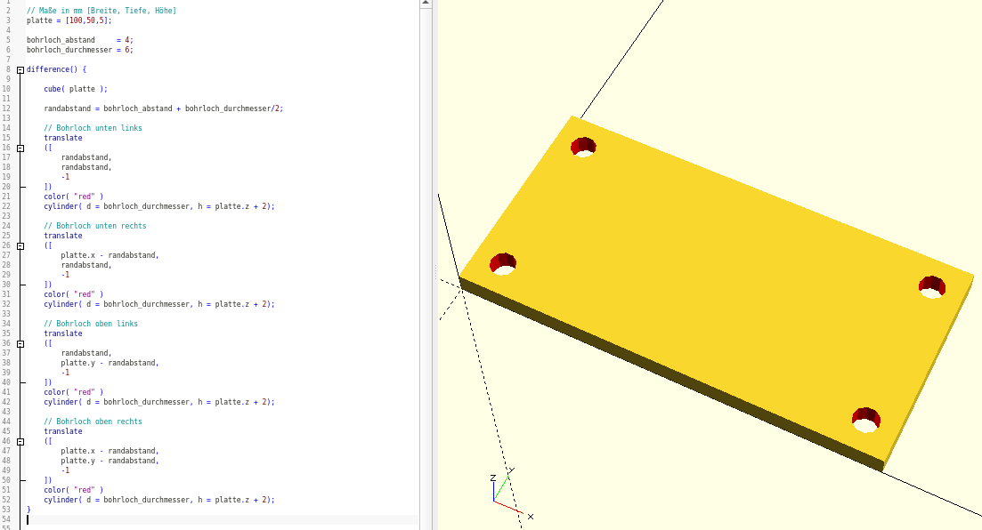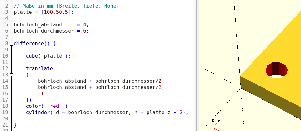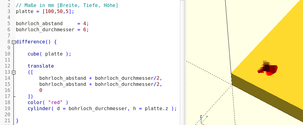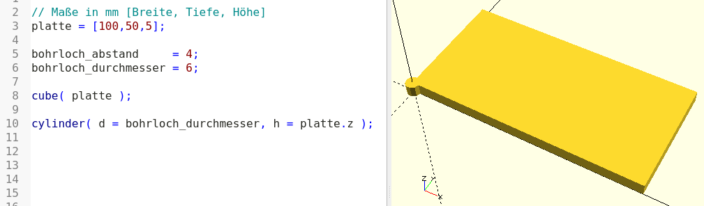 cylinder( d = bohrloch_durchmesser, h = platte.z );Der Parameter d der Grundform cylinder bestimmt den Durchmesser, der Parameter h bestimmt die Höhe. Da der Zylinder unser Bohrloch beschreiben soll, übergeben wir für d unsere Variable bohrloch_durchmesser und für h die Z-Koordinate des Plattenvektors, in der die Höhe bzw. Stärke der Platte definiert ist. Anstelle von platte.z hätte man hier auch platte[2] schreiben können.