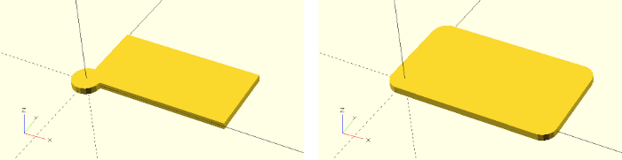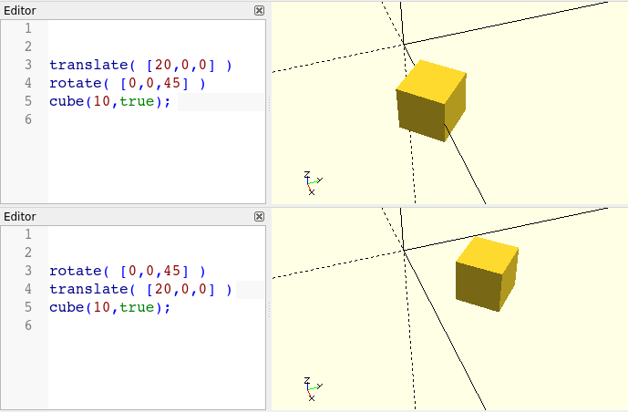 Abbildung 2. illustriert, wie unser Endergebnis von der Reihenfolge der Transformationen abhängt. Da die Transformationen in OpenSCAD sich immer auf den Ursprung beziehen, macht es einen großen Unterschied, ob man ein Objekt erst verschiebt und dann rotiert, oder umgekehrt.