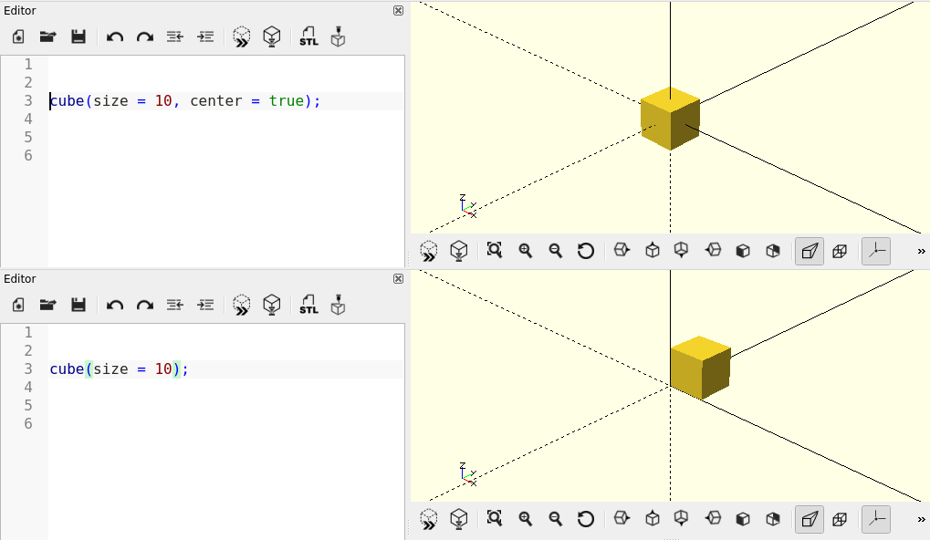 Falls Sie Programmiererfahrung haben, mag der Ausdruck sphere(r=10); Sie an einen Methodenaufruf erinnern. Im Kontext von OpenSCAD ist diese Intuition leider eher hinderlich als nützlich. Es ist besser, den Ausdruck nicht als Methodenaufruf zu interpretieren, sondern als eine Aussage über die Existenz einer konkreten Geometrie. In diesem Sinne besagt der Ausdruck sphere(r=10); in etwa: Es existiert eine Kugel mit Radius 10mm.