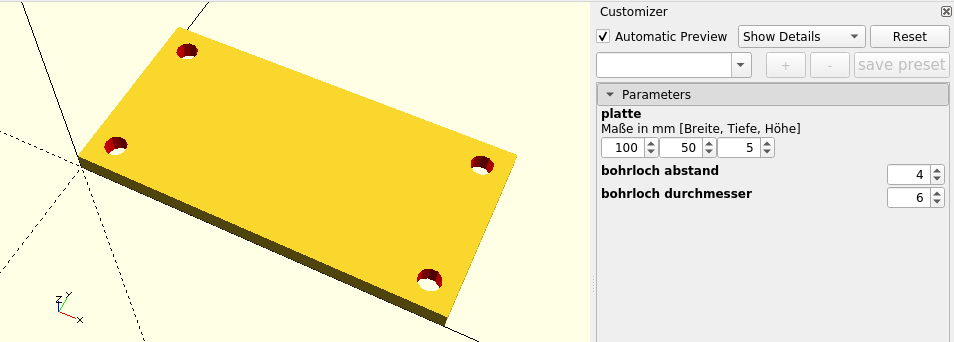 Angenommen, wir möchten nun an den Ecken der Platte vier Bohrlöcher modellieren. Fangen wir damit an, dass wir erst einmal zwei Variablen definieren. Eine für den Durchmesser der Bohrlöcher und eine für den Abstand der Bohrlöcher vom Rand der Platte: