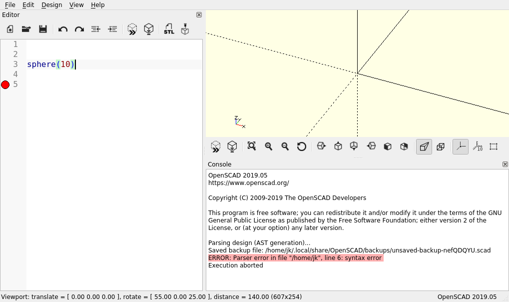 Wenn anstelle dessen ein rot markiertes ERROR in der Ausgabe steht, lief irgendetwas schief (Abbildung 2.). Vielleicht haben Sie sich vertippt? Oder vielleicht das Semikolon am Ende der Zeile vergessen? Haben Sie sphere vielleicht mit einem großen S anstatt eines kleinen geschrieben? Versuchen Sie den Fehler zu finden und probieren Sie die Vorschauberechnung (F5) erneut.
