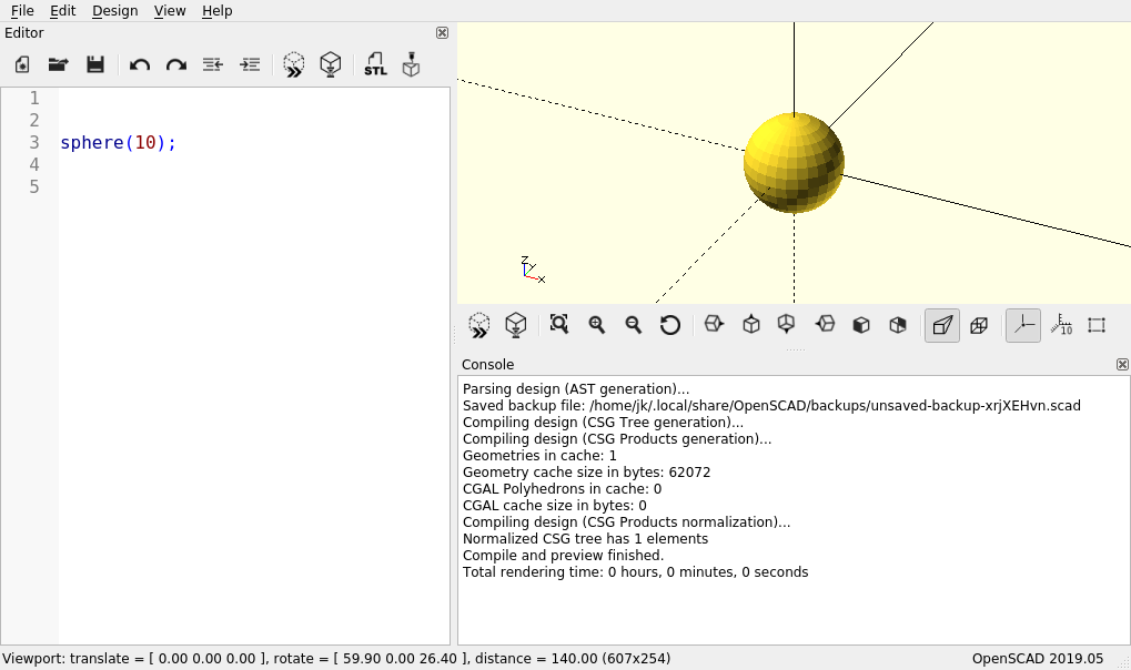 sphere(10);Wenn Sie nun eine Vorschau berechnen lassen (Taste F5), dann sollte im Ausgabefenster eine Kugel mit einem Radius von 10 Millimetern angezeigt werden.