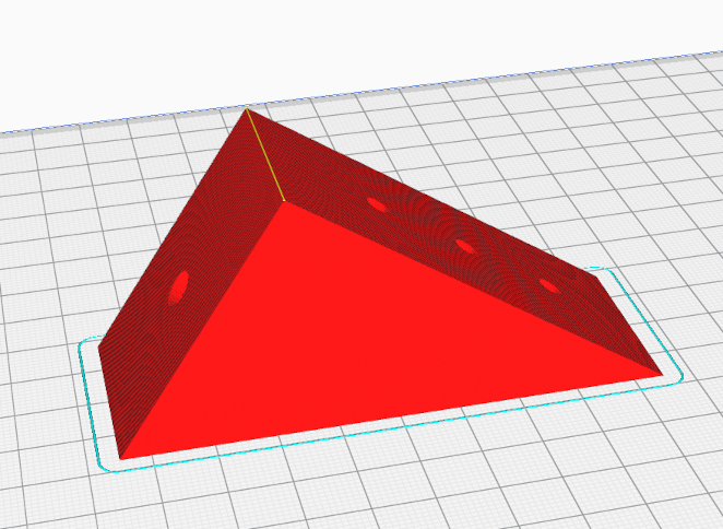 cylinder( d = bohrloch_durchmesser, h = platte.z );Wir wenden zunächst die Transformation color (dt. einfärben) an und färben damit den Zylinder rot (engl. red). Den roten Zylinder verschieben wir dann mittels der Transformation translate in die untere linke Ecke der Platte. Um unsere Modellbeschreibung etwas übersichtlicher zu halten, haben wir den Parameter der Transformation über mehrere Zeilen verteilt.