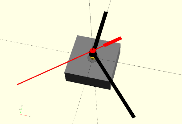 An dieser Stelle muss auf ein ganz zentrales Funktionsprinzip von OpenSCAD hingewiesen werden. Der gesamte Ausdruck translate(...) cube(...); wird ein eigenständiges geometrisches Objekt, dass so wie jede andere Grundform (Kugel, Würfel, etc.) verwendet werden kann! Dies bedeutet insbesondere, dass wir diesem neuen Objekt weitere Transformationen voran stellen können, z.B. eine Drehung (engl. rotation):