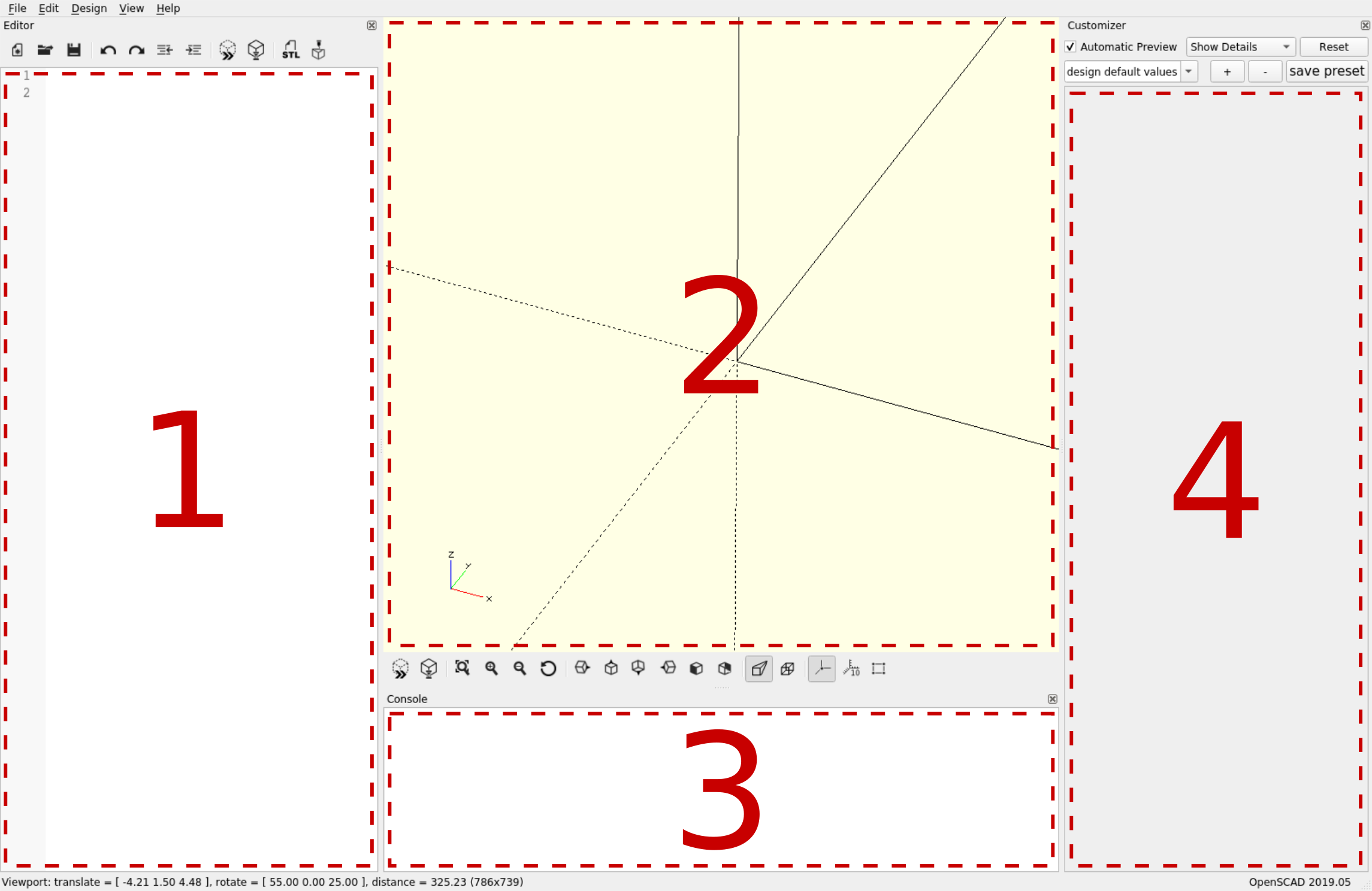 Die Bedienoberfläche (Abbildung 1.) ist in vier Bereiche unterteilt. Der erste Bereich befindet sich auf der linken Seite. Es handelt sich hierbei um einen einfachen Texteditor, der die zentrale Eingabeschnittstelle für OpenSCAD darstellt. Jegliche Modellierung von Geometrien findet hier statt.